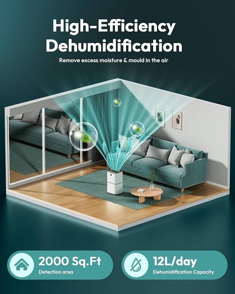- 【2,000 sq ft Large Dehumidifier】Equipped with 3 upgraded air inlets, this home dehumidifier can effectively dehumidify 360° in all directions. Removes up to 30 pints (under 95°F, 90% RH) of moisture per day and adjusts the humidity level from 30% to 80%. This energy-saving dehumidifier is ideal to dry a damp room up to 2,000 sqft and is perfect for homes, basements, offices, bathrooms, bedrooms, kitchens, stockrooms, living rooms, laundry rooms, cellars and crawlspaces.
