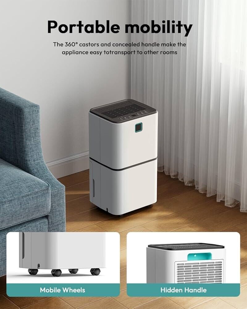 - 【Easy To Move & Maintain】Considering that most bulky dehumidifiers are difficult to move, this unit is designed with 360° rotatable wheels and ergonomically designed handles, meaning that you can move it around easily without scratching the floor. Meanwhile, a detachable and washable filter can preserve fresh and clean air quality.