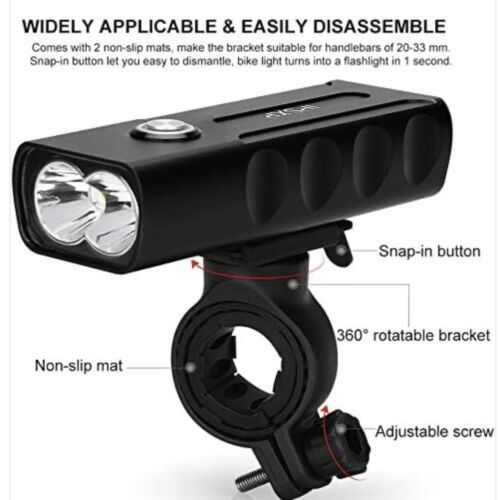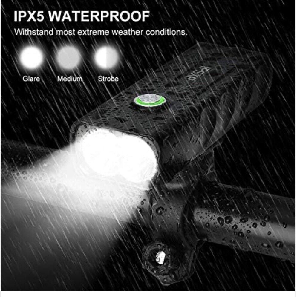 ✅ STRONG SECURITY: IPX5 Waterproof front light withstand all adverse weather. 1000 lumen let you see 300~500 m clearly, improve your visibility and safety. 3 modes(glare light, medium light and strobe flashing) suitable for various outdoor activities. 360° rotatable bracket makes the bike light can shine any direction you want.
