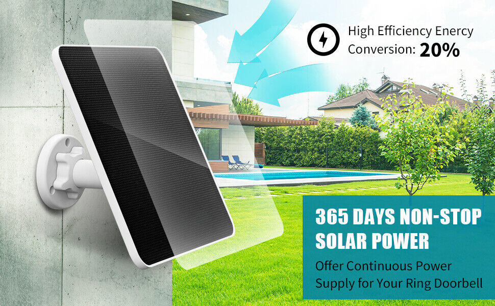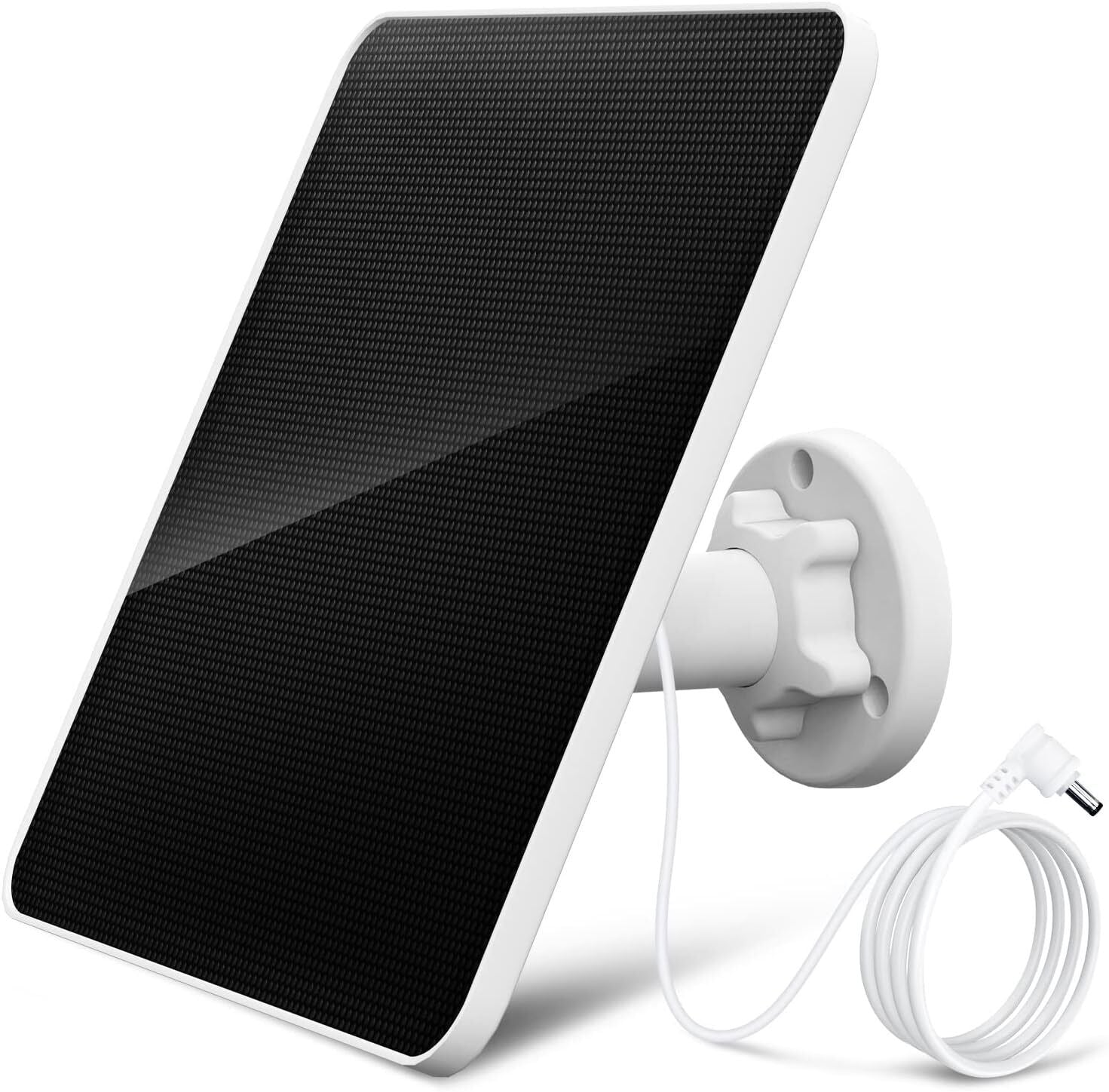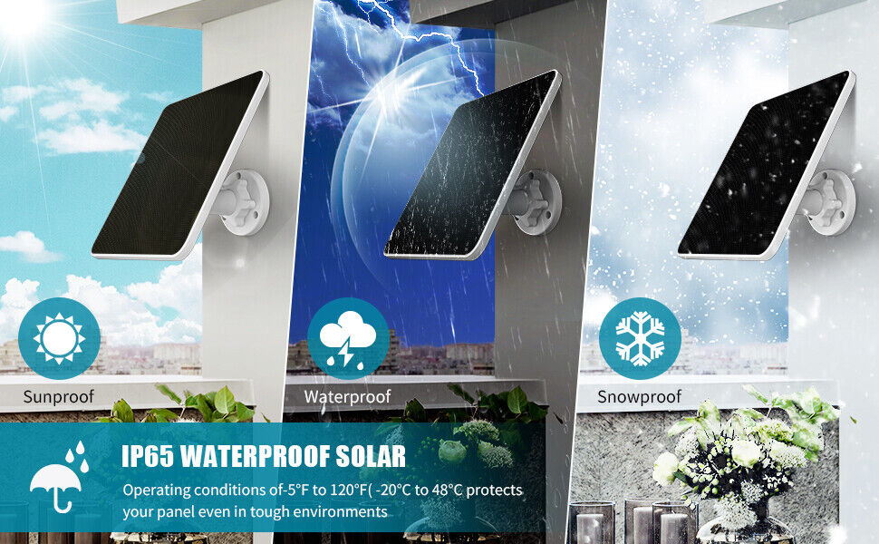 - [IP65 WATERPROOF]: This solar panel for security camera outdoor with IP65 waterproof, the panel surface is made of ETFE material, which makes it smooth enough to drain the rain and water drop, wear-resistant, anti-corrosion. Continuously power your battery operated home security camera.