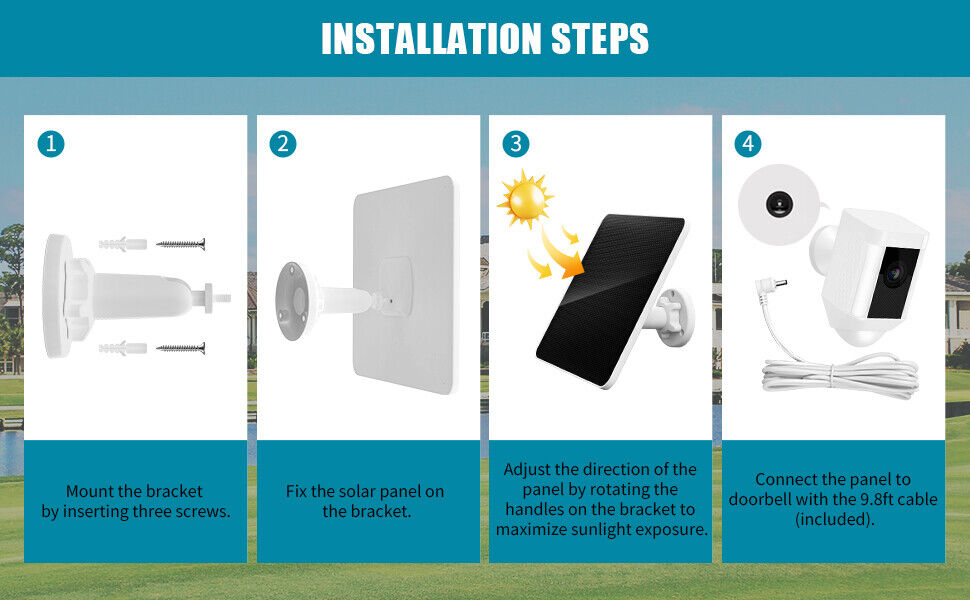 - [VERSATILE MOUNTING]: 7w solar panels for cameras are equipped with 360° adjustable security wall bracket and can be adjusted vertically 90 degrees. 10ft power supply Wire provides greater flexibility for your installation. Ensure that the solar energy gets maximum sunlight exposure.