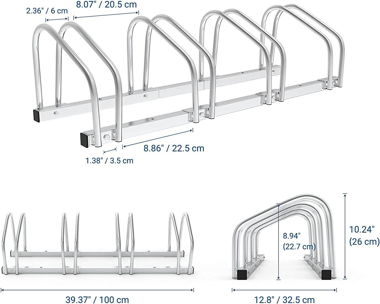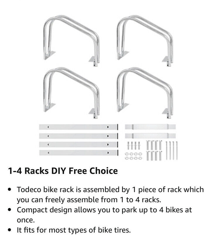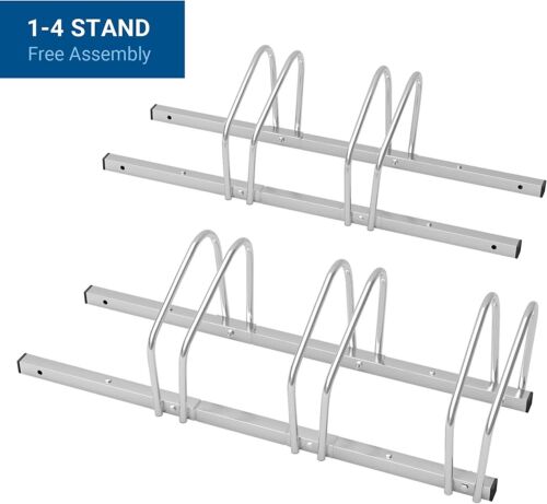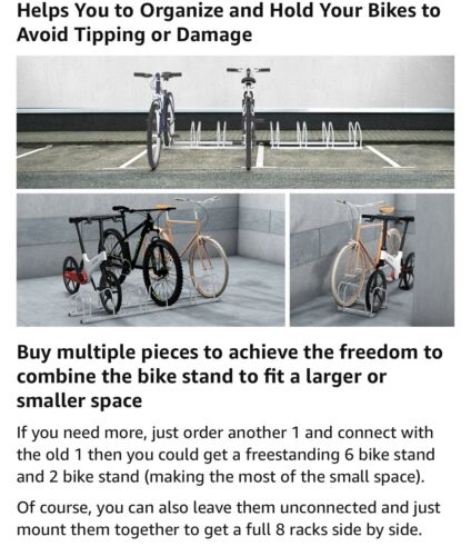 1-4 BIKE RACKS - Our bike parking stand holds up to 4 bicycles. 4Pcs wheel holders are independent that can be assembled freely so you could assemble them to 1 rack, 2 racks, 3 racks, or 4 racks according to your requirements. If you need more, just order another one and connect with the old one then you could get a freestanding 6 bike stand and 2 bike stand. Of course, you can also leave them unconnected and just mount them together to get a full 8 racks.