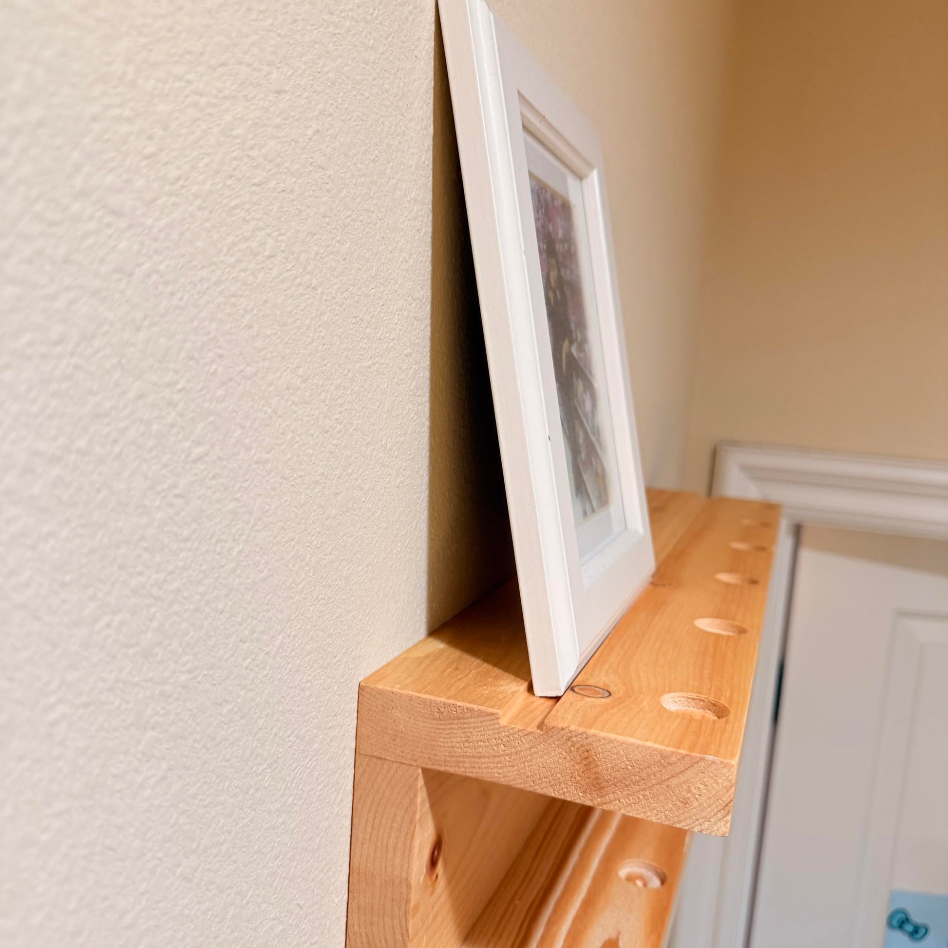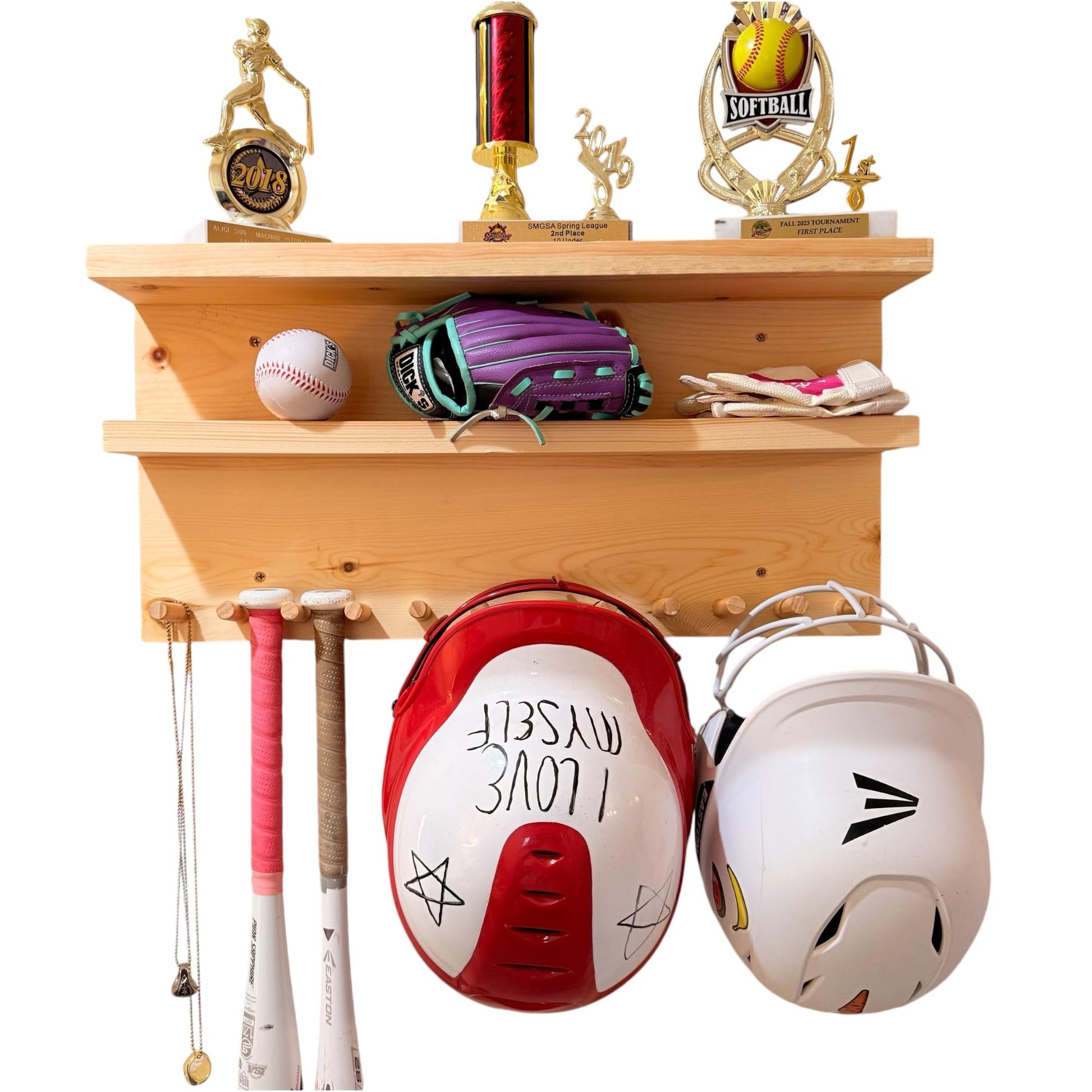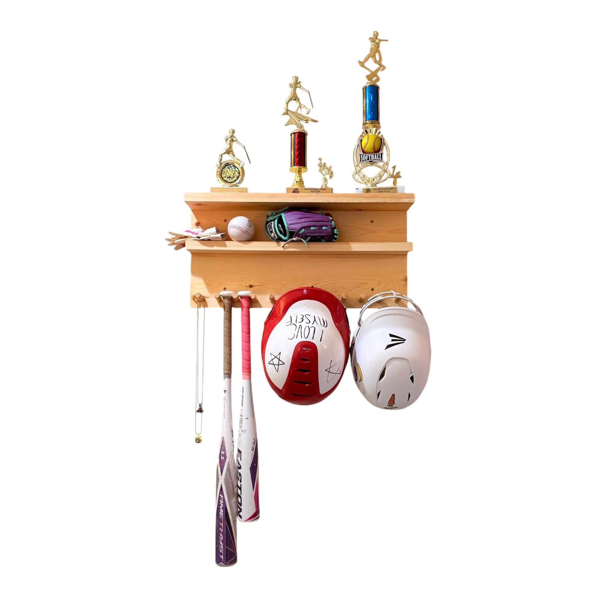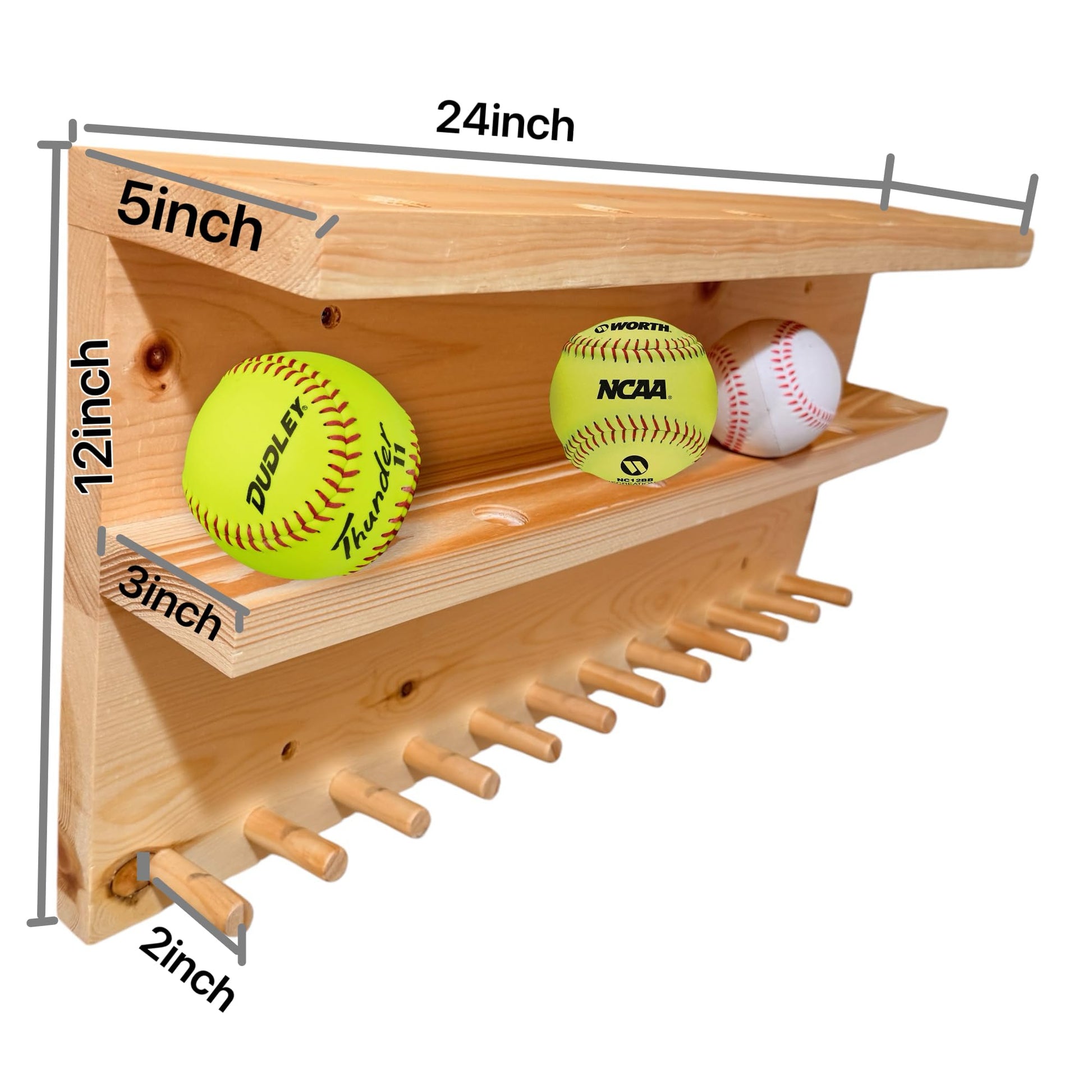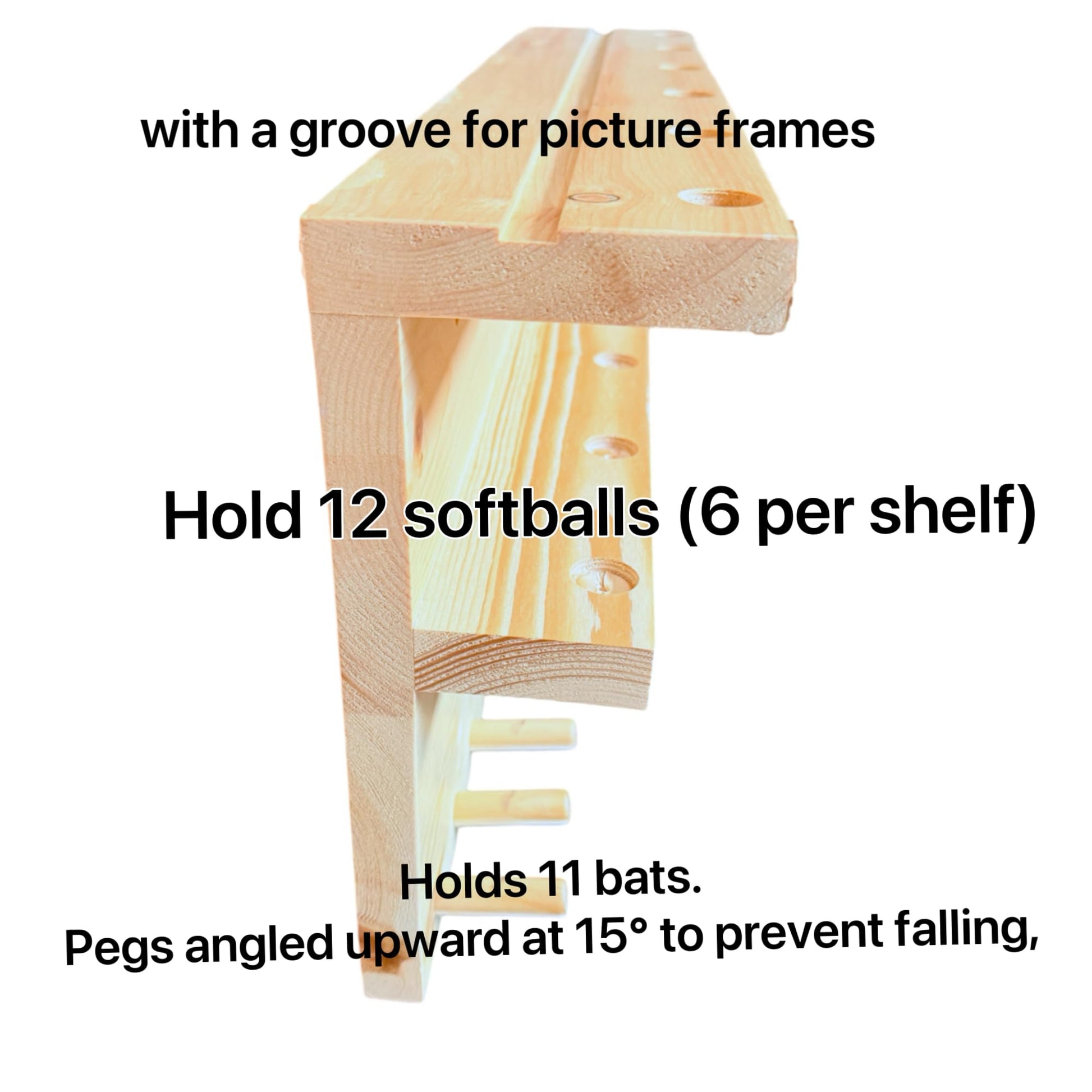 24-Inch Handmade Wall-Mounted Softball/Baseball Storage Rack - 3 Tiers, Holds 11 Bats, 12 Balls, Trophy Display Shelf with Groove for Picture Frames, Supports up to 30 lbs ? Celebrate your athletic triumphs with this handcrafted 24-inch wall-mounted storage rack. Crafted from premium wood, it features three tiers to proudly display your softball or baseball trophies, memorabilia, and gear. With designated grooves to hold up to 11 bats, 12 balls, and even picture frames, this sturdy rack can support up to 30 lbs. Its rustic design adds a touch of charm to any room, making it a perfect addition to your game room, home gym, or den. Easily mount it on the wall and organize your cherished sports equipment and accolades in style. Dimensions: 24 x 12 x 5 inches.