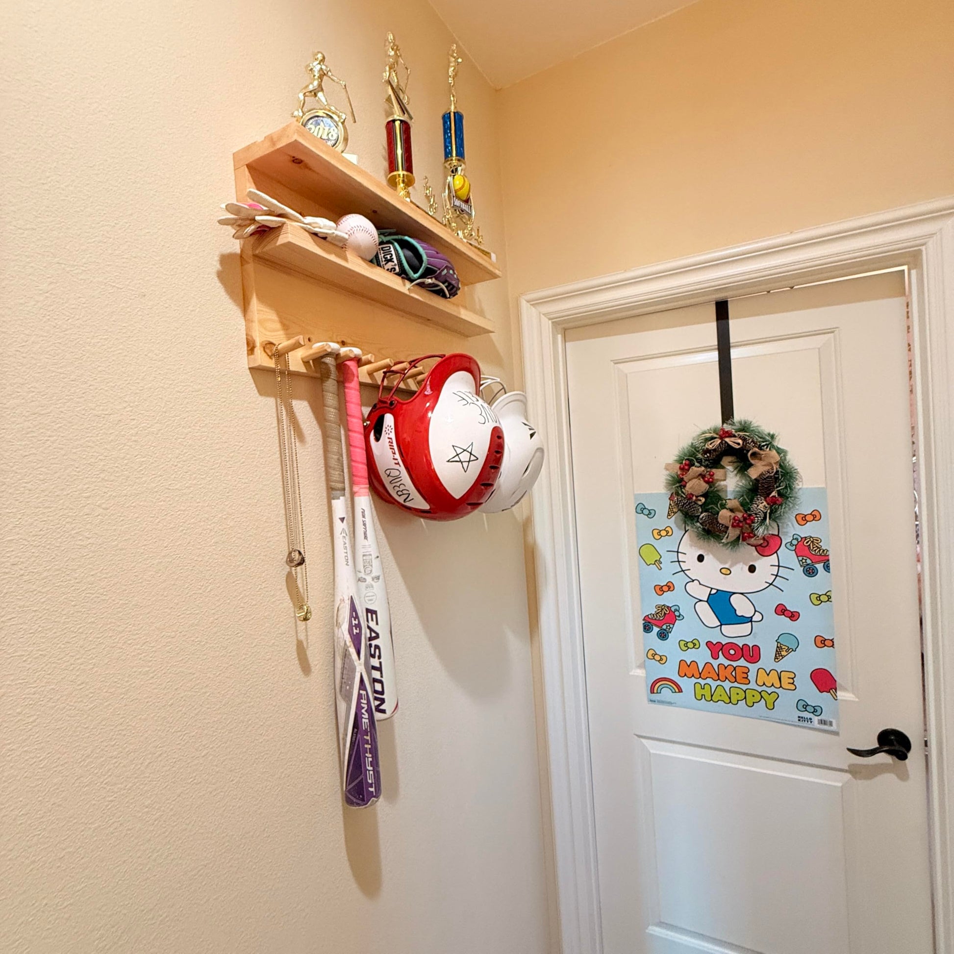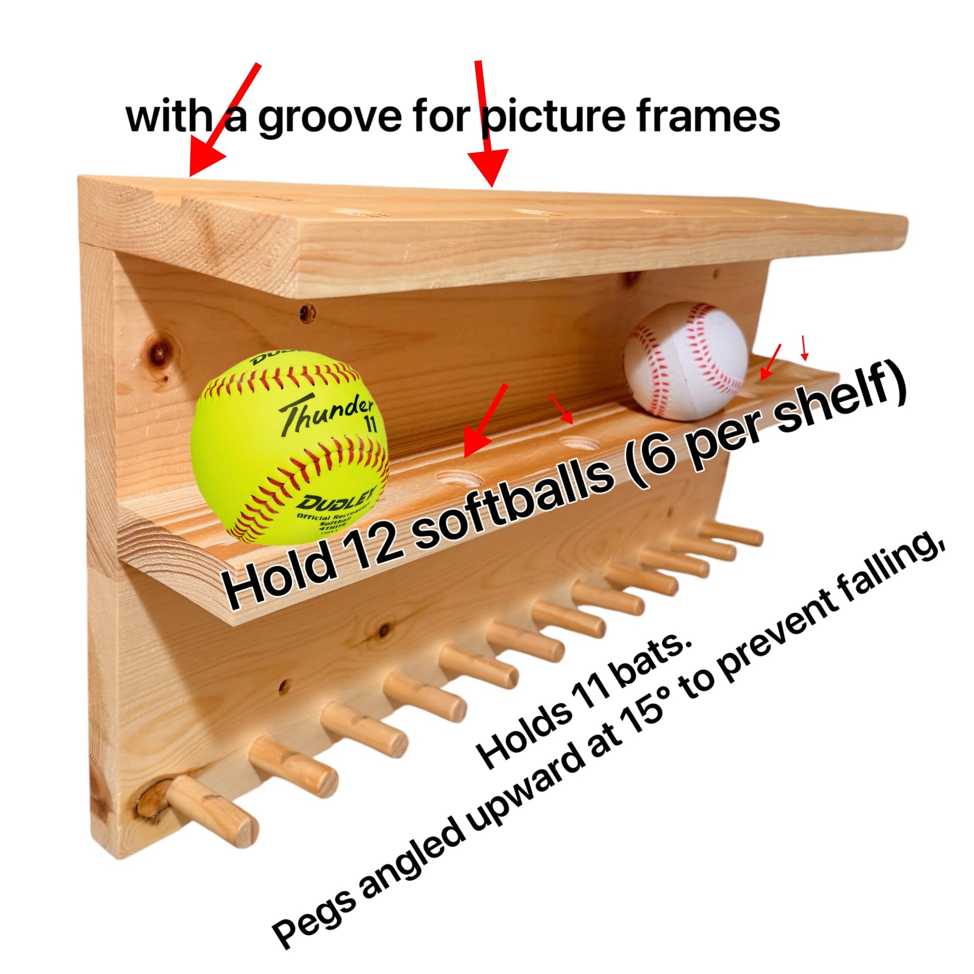 YEEYAYA 24-Inch Handmade bat racks Wall-Mounted Softball/Baseball Storage Rack – 3 Tiers, Holds 11 Bats, 12 Balls, Trophy Display Shelf with Groove for Picture Frames, Supports up to 30 lbs