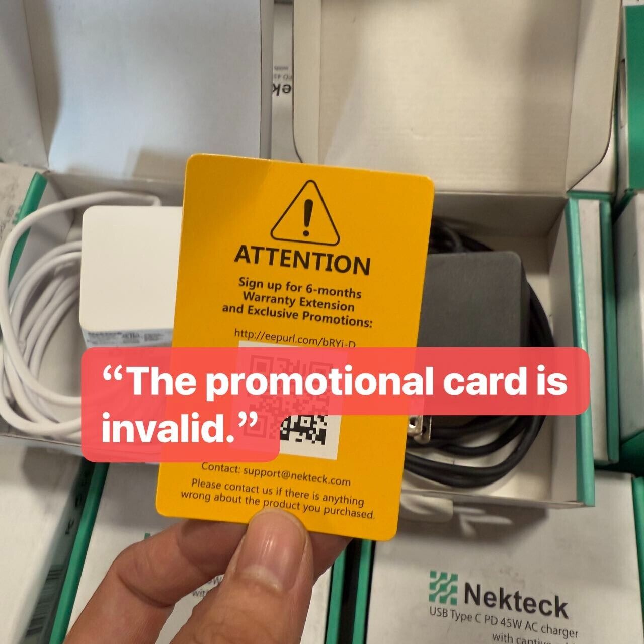 Important Reminder: Any promotional or gift cards included in the boxes are invalid. These warranty cards or gift cards are only applicable to full-price sales channels. Since we handle returns and overstock, these products are no longer part of the standard retail market.