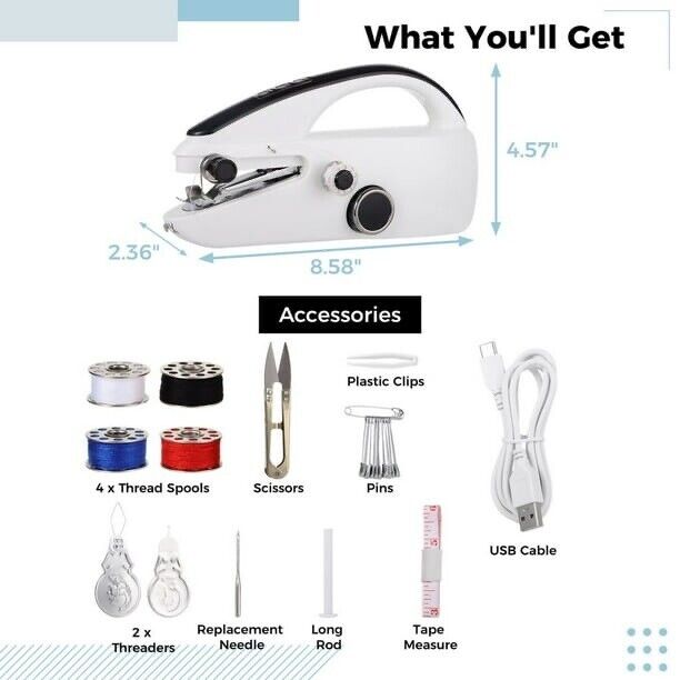 This machine comes with a comprehensive kit that includes essential accessories like thread spools, cutting scissors, clips, pins, a USB charging cable, needle threaders, a spare needle, a long extension rod, and a measuring tape, providing everything required for a hassle-free sewing journey.