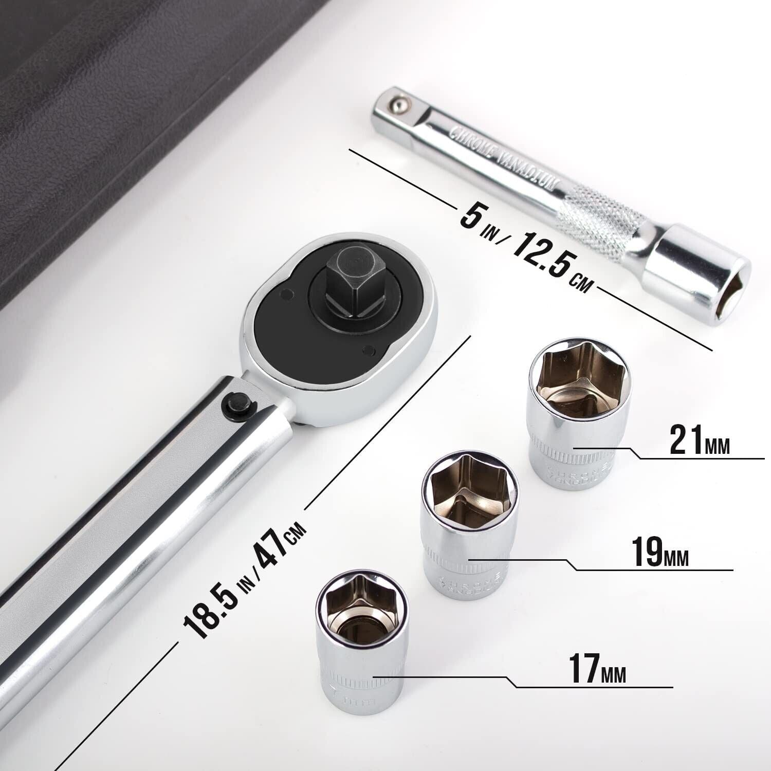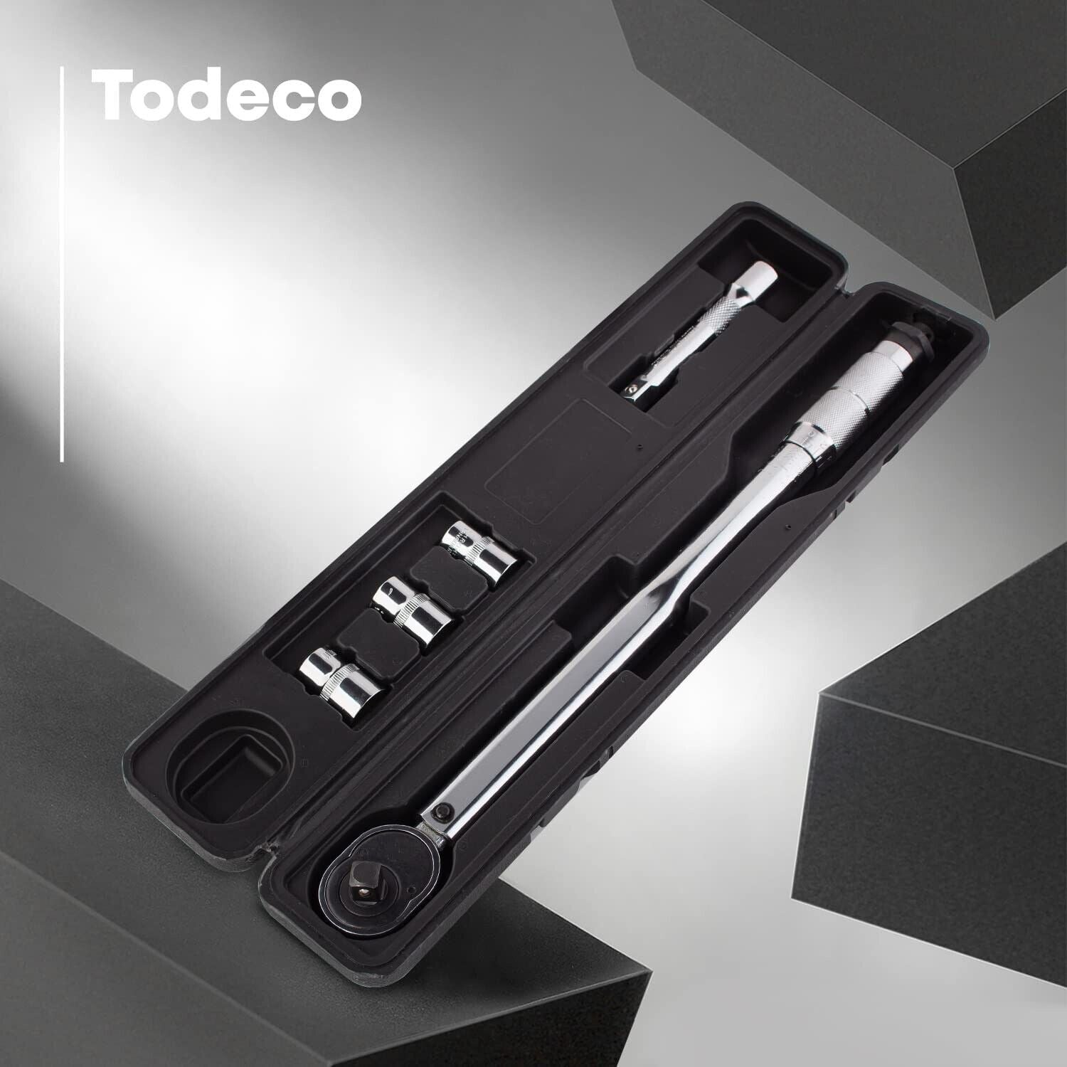 ----------------------------------------------------------------------------Easy Carrying & Storage - Todeco Torque Wrench Set includes 1/2 Inch Drive Click Torque Wrench(20-150 ft.lb /28-210nm), 3* Sockets (17/19/21mm), 1*5" Extension Bar and 1*blow-molded case. The 1/2 torque wrench and all its parts are packed in a sturdy plastic case, not only providing good protection for them but also keeping your tools organized and portable.