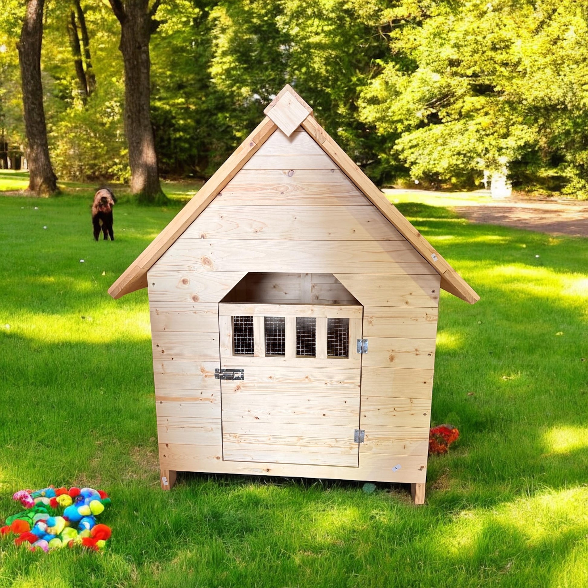 Elevate your home's interior with this versatile wooden dog house that doubles as a stylish storage solution and playhouse. Crafted from high-quality wood, it boasts a durable and waterproof construction, making it suitable for both indoor and outdoor use. With its charming design inspired by traditional architecture, this piece seamlessly blends form and function. The spacious interior provides a cozy retreat for your furry companions, while the front door and side windows offer ample ventilation. When not housing your pets, it can serve as a delightful playhouse for children or a decorative storage unit. Effortlessly complement any decor with its natural wood finish. Dimensions: 36 inches long, 24 inches wide, 30 inches high.