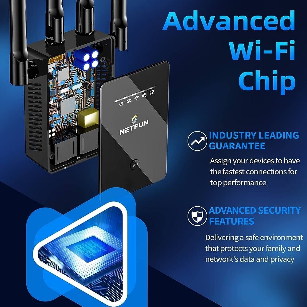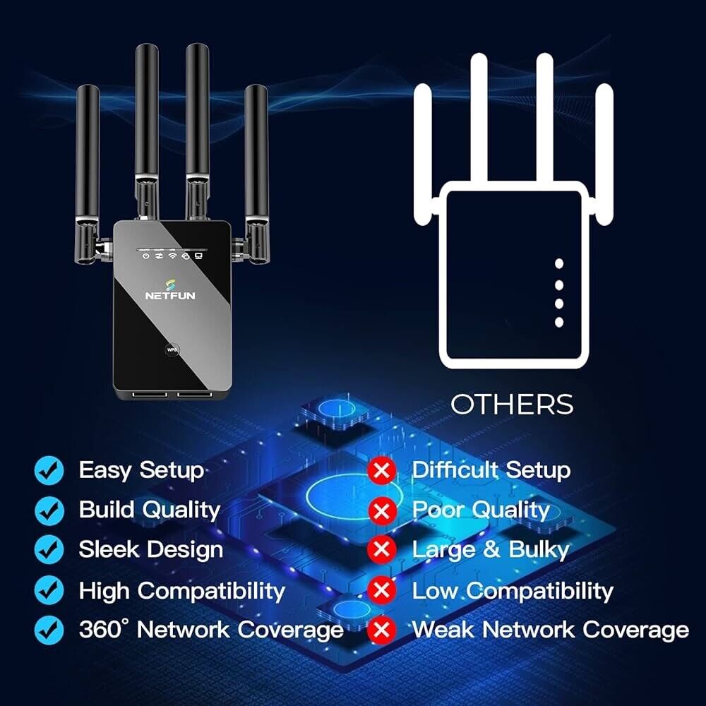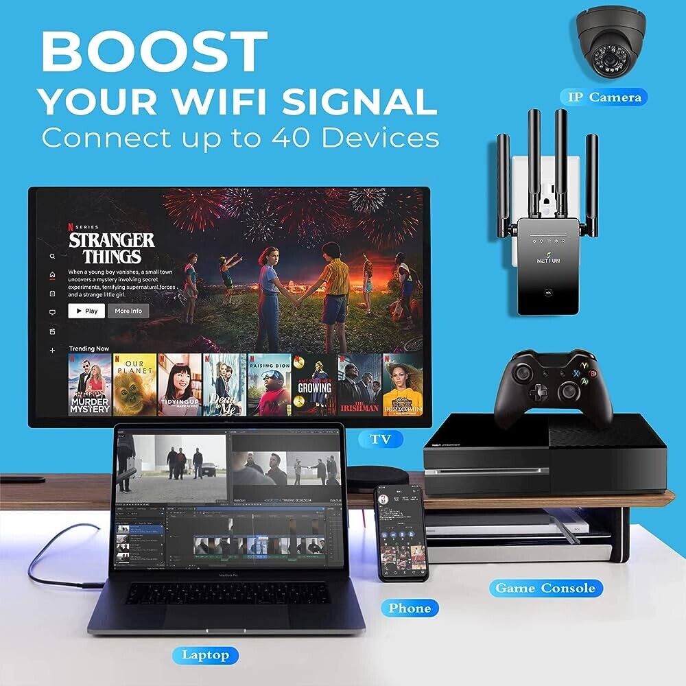 UP TO 9956 SQ.FT - SAY GOODBYE TO WI-FI DEAD ZONES. Netfun WiFi range extender extend and boost your existing Wi-Fi to hard-to-reach areas, covers up to 9956 sq.feet. Penetrates floors, walls and extending your internet wireless network to every corner of the house, and beyond to the front porch, backyard and garage.